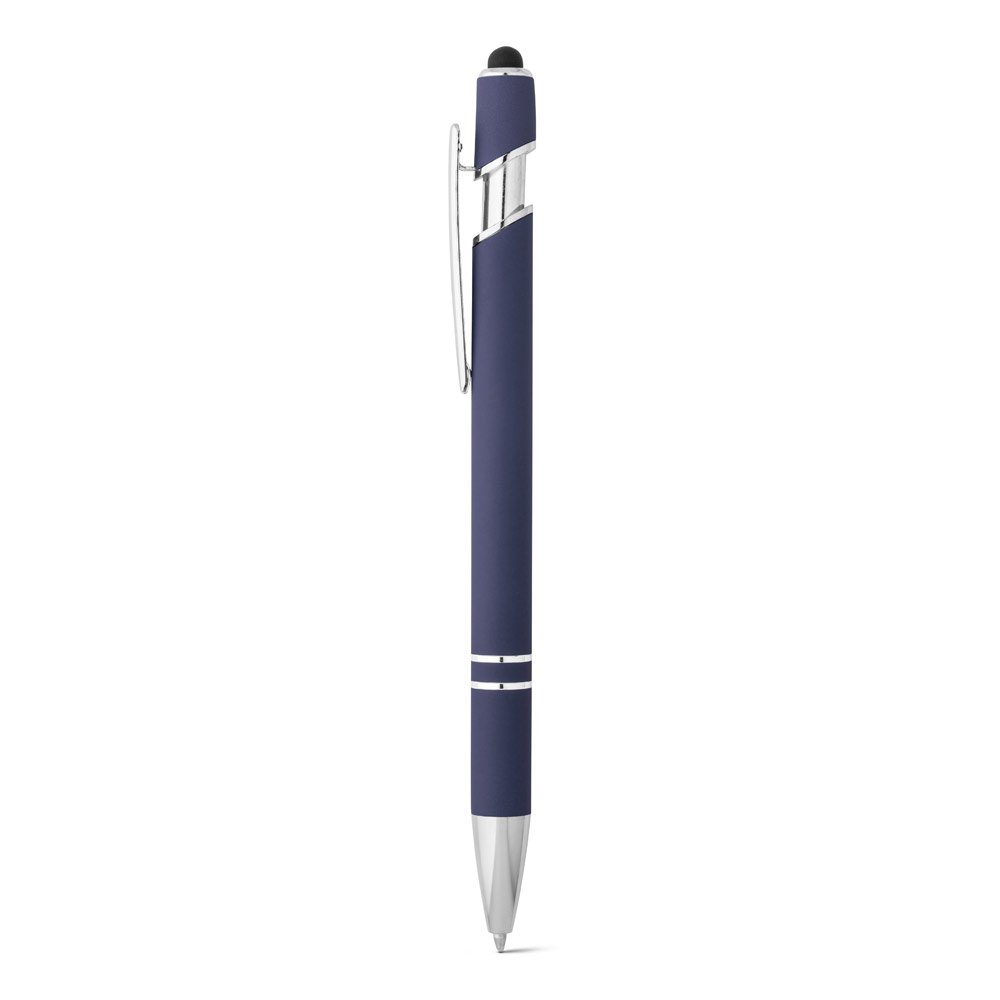 Esferográfica em alumínio com acabamento emborrachado. A esferográfica tem clipe em metal, ponteira touch no topo e escrita em azul até 1.5 km. ø10 x 143 mm